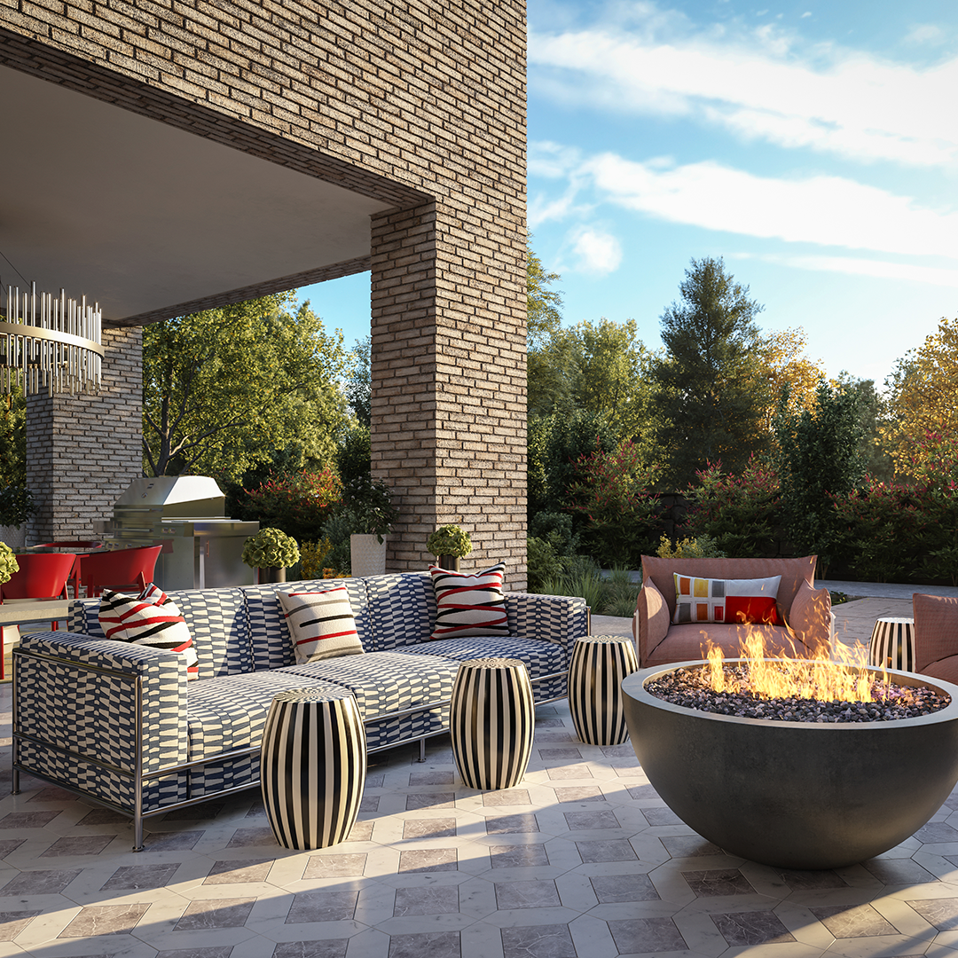 "Things are laid out in a way that you would typically find on the inside of a great room or a beautiful study," the designer says. He centered the fire pit within the lounge space, scattering furniture around it so that the area takes on a grand feeling.