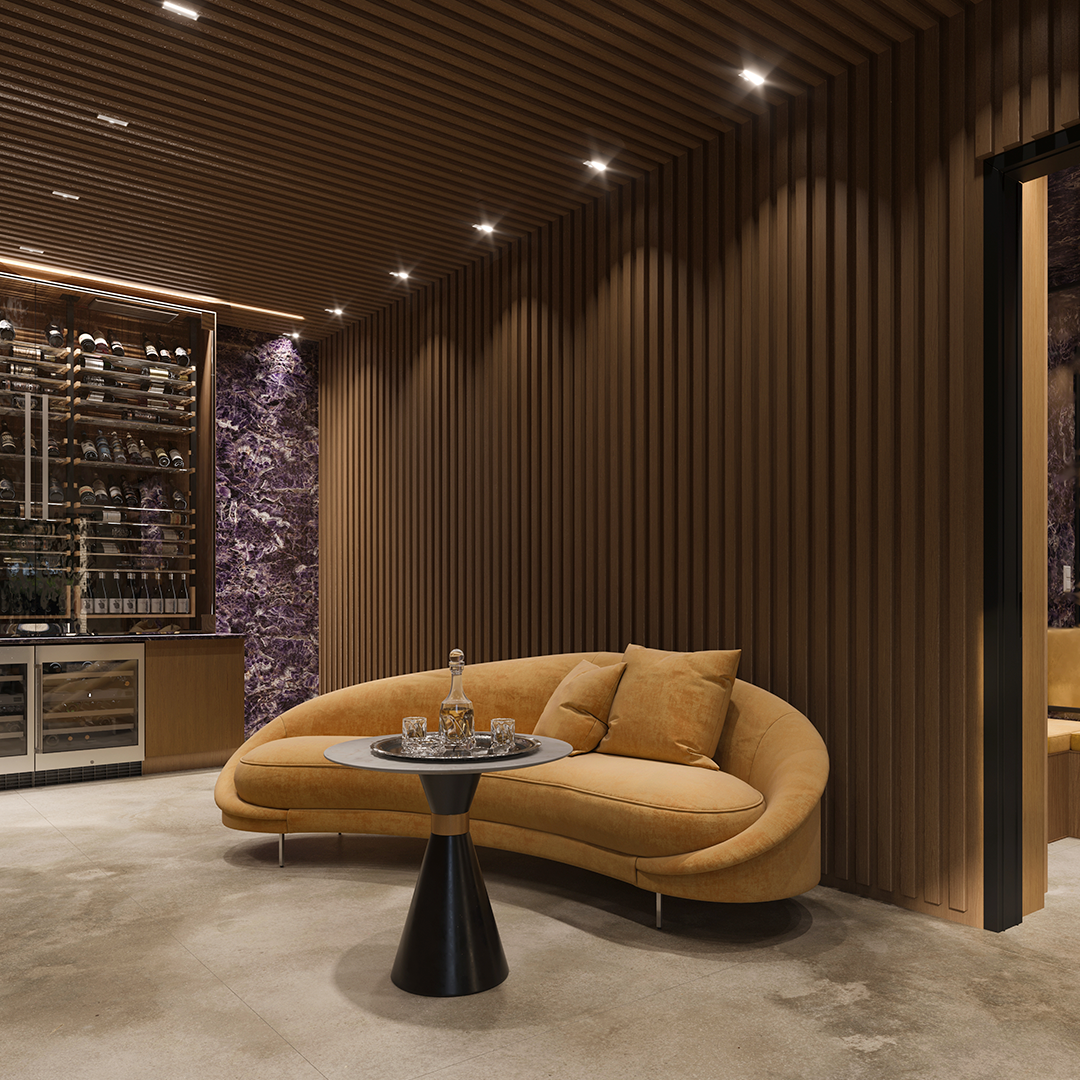 The garage is wrapped in an earthy walnut that’s presented in an unexpected way. "We added a fluted design to add more of that design feel to it," Danso explains. That one move transforms the walls and ceilings from an afterthought into an exciting design element.