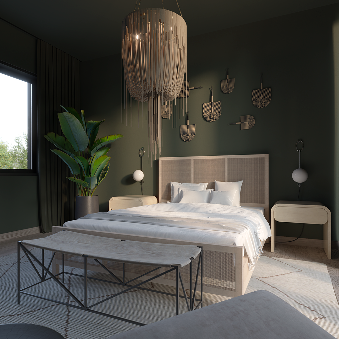 A love of nature and plants informs both the color palette and the products she selected for the room, from the woven hand fans installed above the bed to the natural tree stump that’s used as a side table and the cane bed.