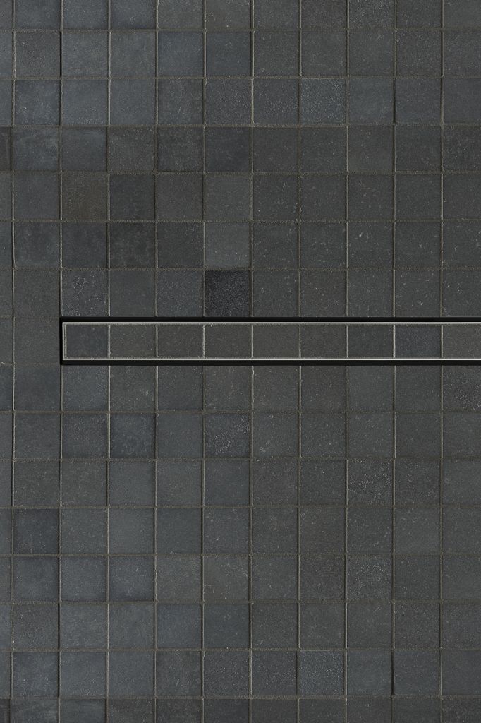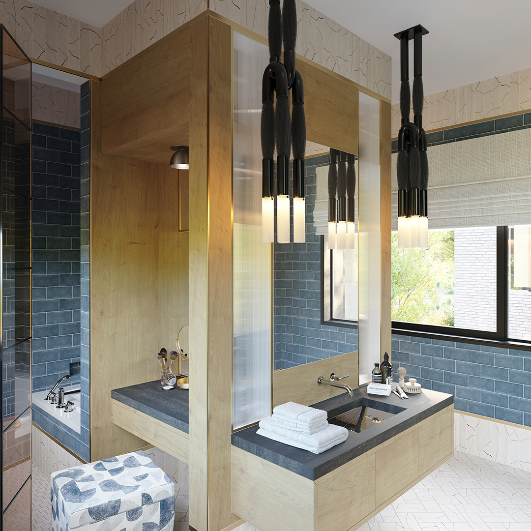 Blue-gray tiles on the wall offer up a calming, water-inspired effect. White was careful not to overpower that sensation with the other surfaces, such as the countertops, which are a black charcoal color that isn’t overwhelmingly dark.
