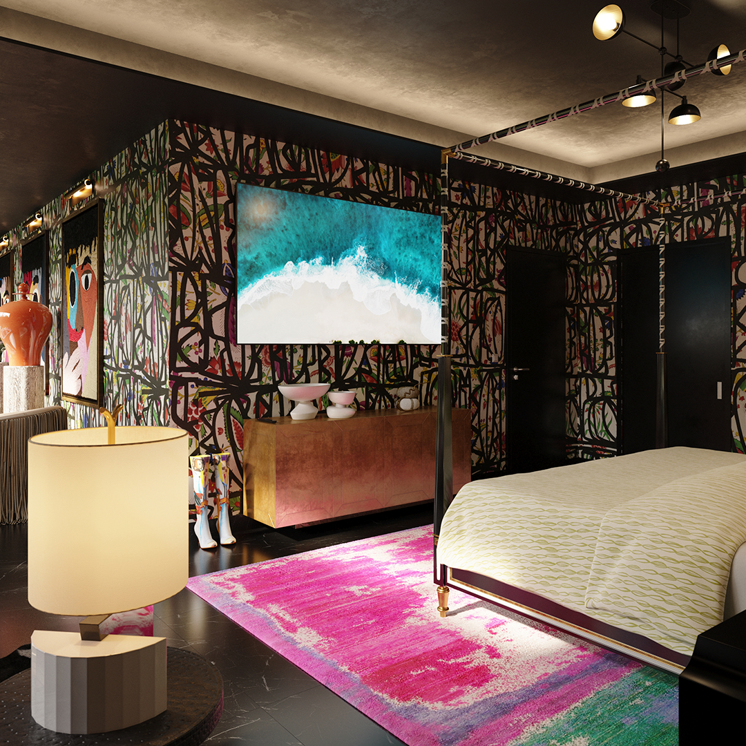 The Couturier Canopy Bed by Caracole, with a leather headboard, gold- and silver-leaf accents, and brass inlays, is a standout. But at the end of the day, its main purpose is to provide a relaxing place to sleep. Rest is "one of the most important aspects in our fight for equality," McSwain underscores. The Purple mattress was also selected with comfort in mind.