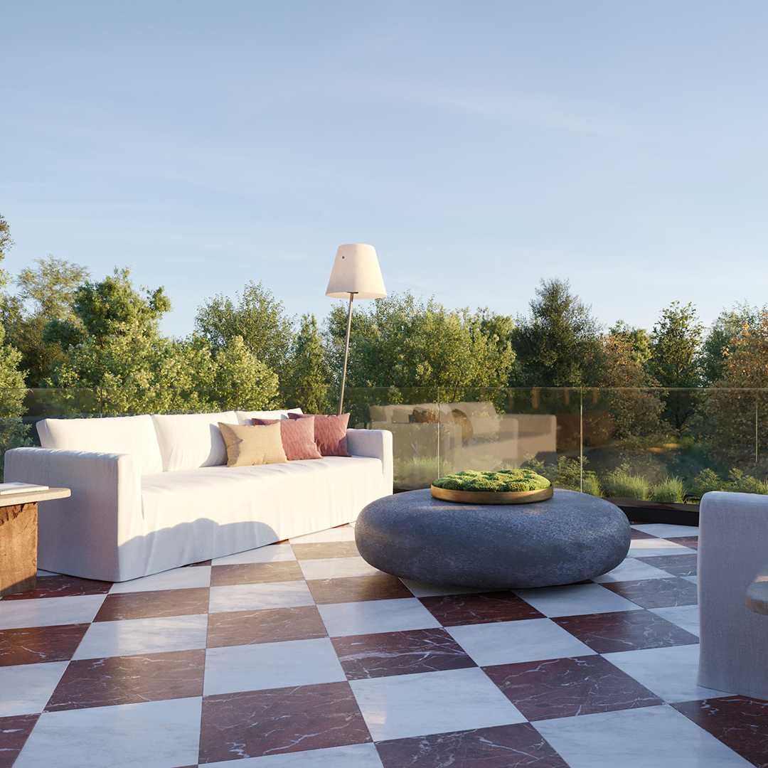 While Curtis and Bolden wanted to create a rooftop space that felt natural and organic, they put a pop of color underfoot. The checkerboard pattern floor incorporates a red tone—"so the space really sings to you once you get there," says Curtis. Otherwise, the furnishings lean neutral.